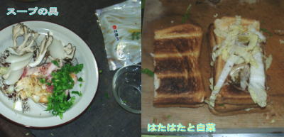 お弁当はサンドイッチとスープ このごろストーブに乗せたやかんからスープを作るので温度 が高いのでは?スープの具が多くても大丈夫みたい。 具は肉、大根葉、舞茸にお餅、サンドイッチははたはたに白 菜でした。 |