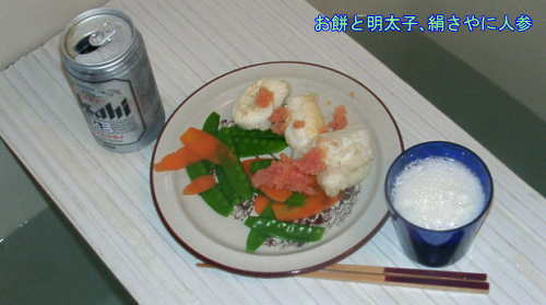 先ずお風呂、お餅を焼いて明太子をまぶし、絹さやと人参で当面の危機脱