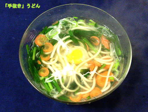 なきゃ。というだけでいつもの「手抜き」うどんです。にらと人参とわかめ、