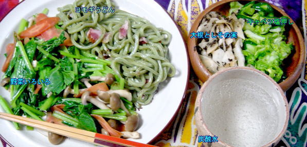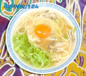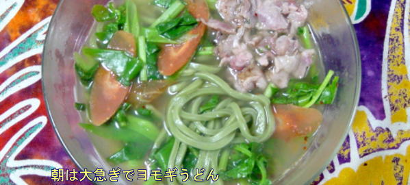 またまた今日も「最短距離」朝食、ヨモギうどんです。具は豚と人参、小松菜、つゆはスープの素