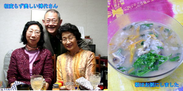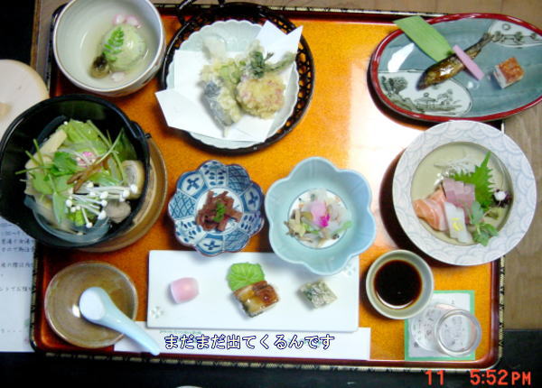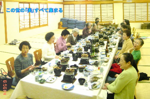 楽雅樹帖に「温泉おじさん」(誰だかよくわから ない)書き込まれた「吉野で花を見ながら温泉 に入りたい」が発端になり、当初は6人くらいに なりそうだったのですが、結局由美、miyuki、 ナルナル、とおじさんになりま舌。3人は星仲間、 お茶仲間です。星関係にはいろいろ出没する ので仲良しになりま舌。 10時半新大阪集合、朝は「手抜き」うどんで最 短距離を目指します。 花見は花見のページに任せて、ここは豪華夕 食をご覧あれ。葛、生麩、山菜など本当にいろ いろ、素敵な夕食でした。 |