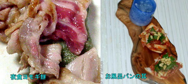 帰ってきてお風呂はパンの耳が残っていたので焼いて、キムチ、しそ、松の実をのせて、焼酎ロッ