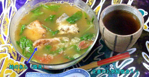 朝は定番のお粥、ただし、東京からの帰りに姫路駅前で買ってきた鮭のあらを入れま舌。