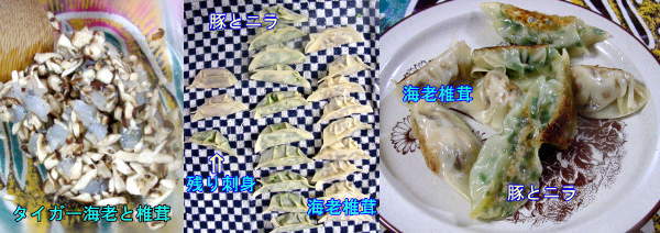 久し振りに餃子にしました。ブラックタイガーと椎茸、豚ばら肉とニラ、それに2個だけ残り物の刺身