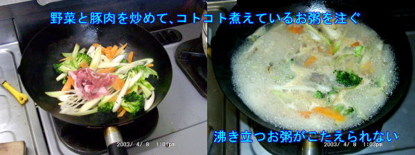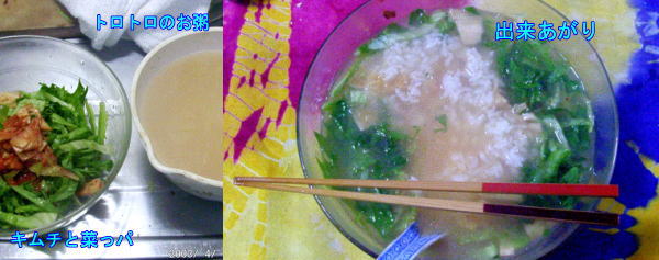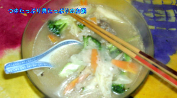 朝は定番のお粥です。つゆたっぷりの粥部分がとってもおいしくできま舌。具もあんまりできちゃ