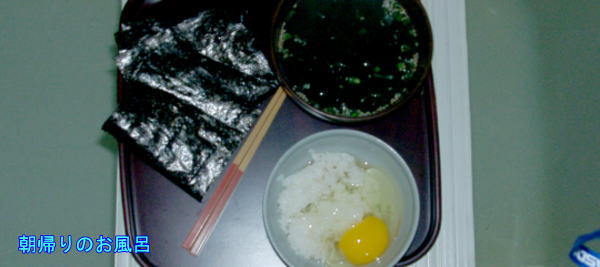 袋入り「わかめスープ」、海苔(上手に焼けま舌)に生卵、手間要らずですぐに寝ました。