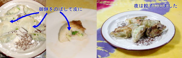 夜は餃子にしました。皮が足りなくなったので、御餅を軽くチンして麺棒でのしてみました。あまり