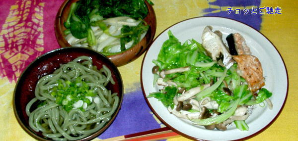 ヨモギうどん冷、お浸しはチンゲン菜とうど、右のお皿はキャベツときのこの炒めと、鮭と鯛の