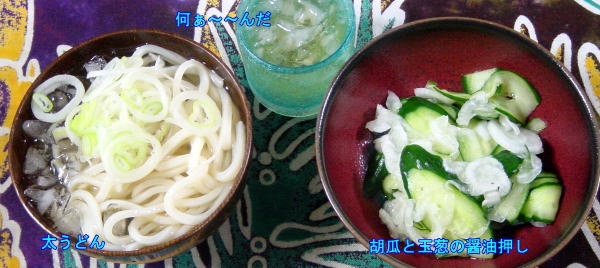 というわけで、太うどんを冷やしで、それに胡瓜と玉葱の浅漬けだけです。