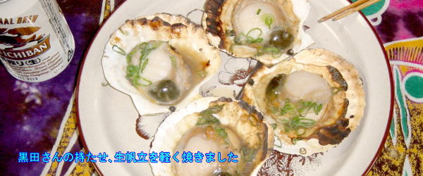 黒田さん、いつもいろいろ持ってきてくれるんです。今日は生帆立、牛肉のバラ、チーズのサンド