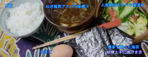 ご飯、のり、上手に炊(焼)けました。ゴキゲン。卵もうまかった。・・・・・・