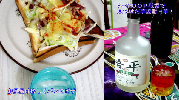 を入れて薄く焼いた歯触りのいい)に乗せ、お相手はCOOPの紙パック入りの芋焼酎です。