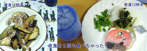 なす、きのこの肉炒め、チーズに玉葱、しそ、わさび醤油、なぜか2回も夜食してしまいました。