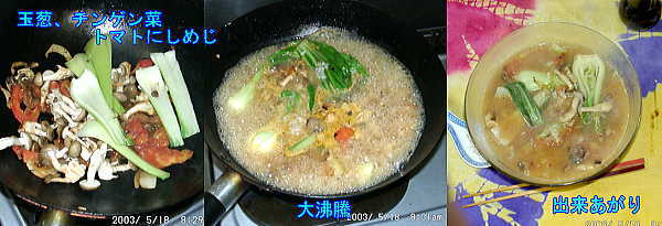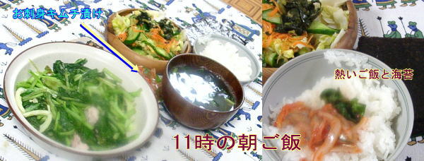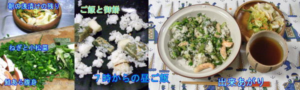 朝は例によってお粥で酢。玉葱をいためと的、しめじ、ちんげん采を入れ、そこにおかゆを注ぐ