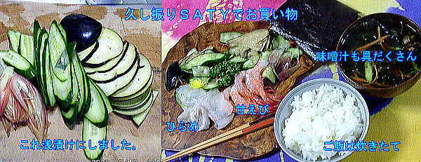米茄子の浅漬け、お刺身に味噌汁、のりにご飯、食前食プラス豪華昼飯、ゴキゲン!!!