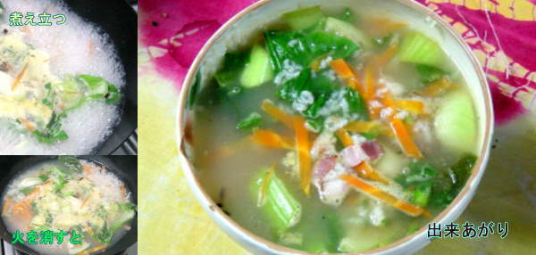 までゆっくり炒め、かつおだしで野菜の具でスープにしました。目玉焼きはベーコンとセロリを