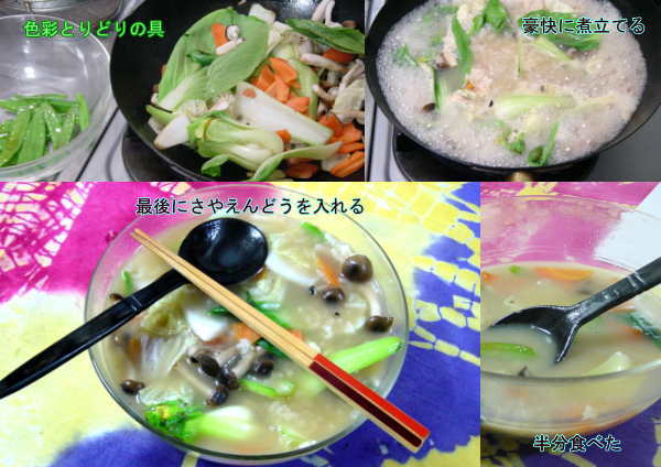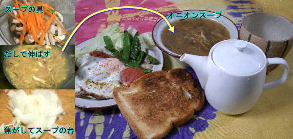出します。スープは袋入り(今日はオニオンスープのの素)にたっぷり具を入れます。お湯だ
