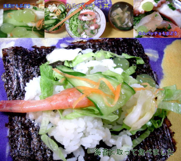海苔で巻いたカルパッチョとご飯、噛むとジューシー、チョッと発見でした。ぶどうも歯に触ったと