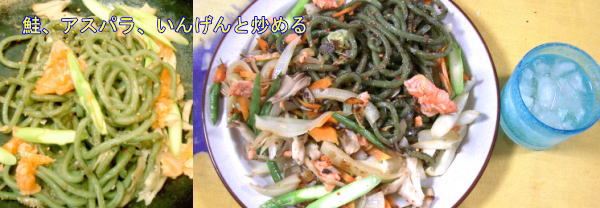 何とか時間を盗んでの夕(夜)食はヨモギうどんを鮭と炒めて。鮭はあらで買ってきた腹身