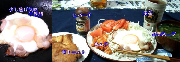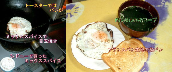 そのため、と言ってよいか、トーストに目玉焼きの簡易朝食です。ちょっと焦げた半熟、に石垣