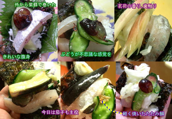 海苔、ご飯、野菜いろいろ、もちろん魚とぶどう、いろいろな味、いろいろな歯触り、混じったり