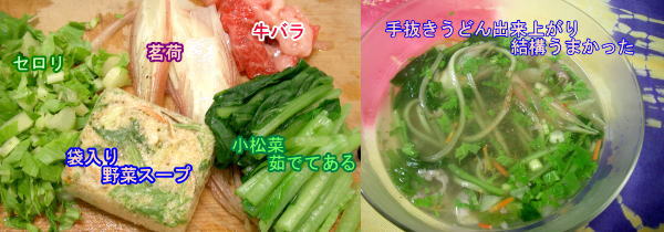菜のおひたし、刻んだセロリと茗荷、牛バラ肉を煮立ったお湯でスープの素と混ぜ、茹でた