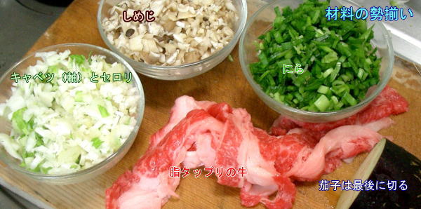 うのでは。ニラは餃子の定番、そして茄子は牛の脂と合う、なんて思いながら材料をきざみ