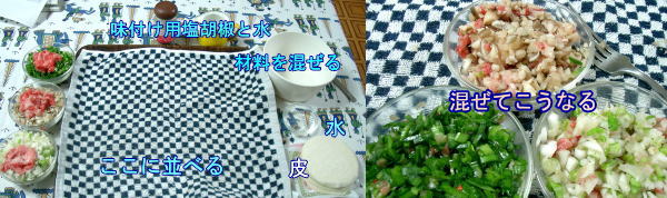 肉も刻んで野菜と混ぜ、塩胡椒(石垣のタイフーン)と水少し(ジューシーになります)を加え