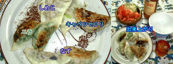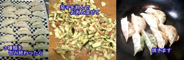 3種類包み終わったら茄子も刻んで混ぜて包んで合流、焼き始めます。