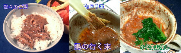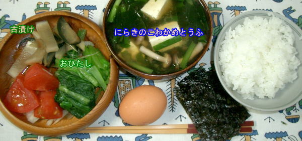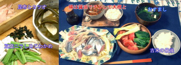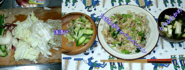 冷蔵庫から手当たりしだい出してきて浅漬けと炒め飯、おすましに分けて・・・・・・・・