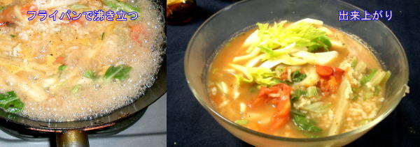 朝は時間的にはゆっくりだったのですが、フライパン一回加熱料理プラスインスタントスープ、