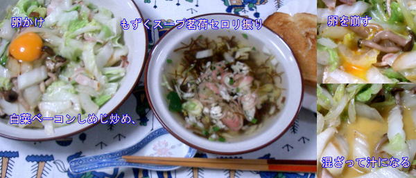 白菜は軸たくさんで、ベーコンしめじと炒め、卵をかけました。インスタントもずくスープは瀕死