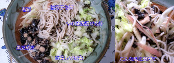 信州は上田の渡辺さん差し入れの干しそば、きざんだ白菜をしその実醤油漬け(味付け
