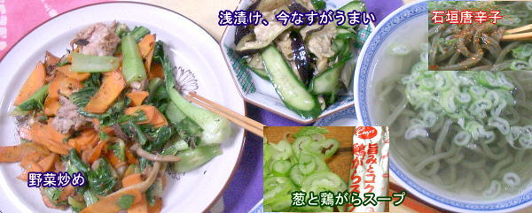キノコから豚肉まで、いろいろ入った野菜炒め、なすがうまかった浅漬け、そしてちょっと手