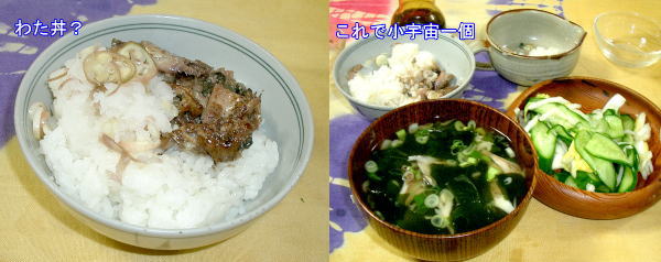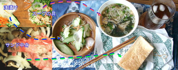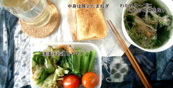 浅漬けはたたみちりめんを炙って胡瓜人参大根と塩で圧します。スープは袋入りわかめ