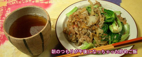 昨夜新米で炊いたご飯をチンして石垣のチャンプルの素、胡椒にたまねぎちんげん菜ベ