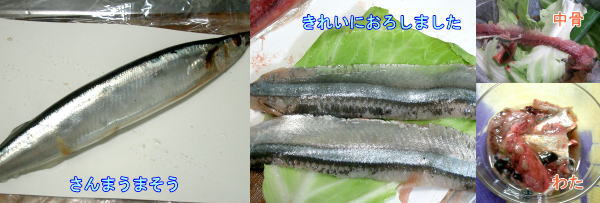 キラキラ銀色のさんま、先ずわたを取り出します。刺身を作り、残りのおいしそうな部分はわ