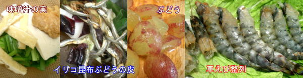 △コーナーです。味噌汁用のイリコと昆布、それにお隣のぶどうの皮がご出棺を待っています。