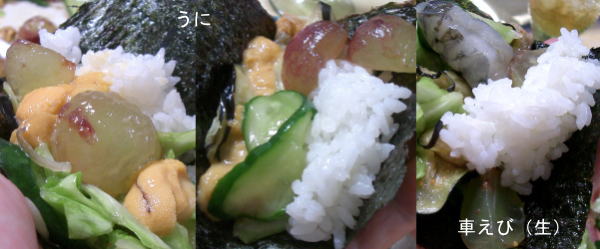 刺身、海苔、新米の無敵三角形、手巻き寿司の陣形で進み始めました。そうです。小腹の