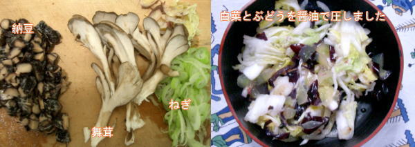 丹波黒豆納豆をきざんで、舞茸は軽く茹でて風で冷やす、そして刻み葱、適当にスパイス、