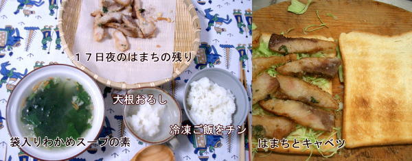 はまちの残り醤油漬け、片栗粉を振って油を潜らせました。朝昼両方です。そして・・・