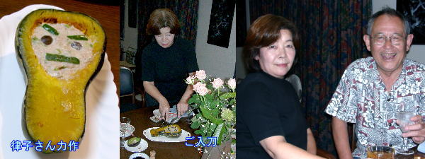 昼間笠沙間でドライブして買ってきたひょうたん型のかぼちゃで律子さんが力作を出品入刀