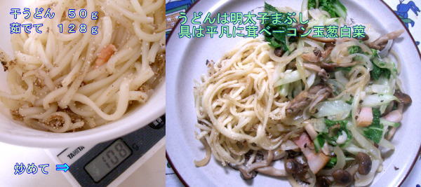飲み会で帰れなくなって今日から出勤です。干しうどんを硬めにゆでて、明太子と炒め、具