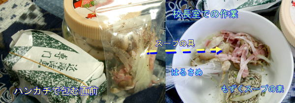 ハンカチで包みます。自然学校ではスープの具をボウルに入れ、スープの素、はるさめを足
