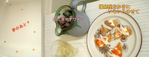 播磨屋お煎餅にバターと、明太子、いくら、塩辛を乗せて玉葱スライスを散らしました。ワイ