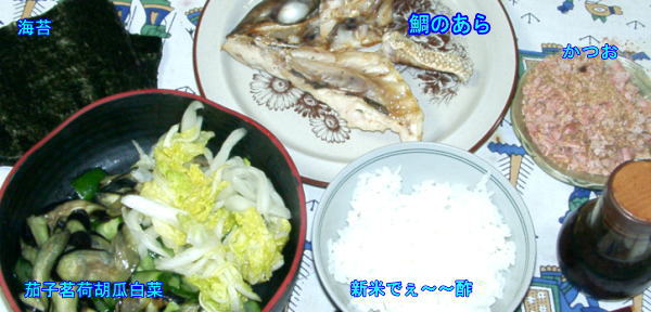 お風呂のお湯が溜まるのを待つ間に冷凍庫から鯛のあらを出し、茄子茗荷胡瓜と、白菜を