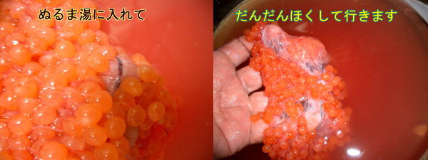 ぬるま湯につけてゆっくりほぐして行きます。卵がこわれないように、丁寧にゆっくりです。