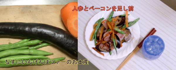 主人にナイショでお風呂で食べま舌。但東町で買ったなすといんげん、ちょっと人参とベーコン