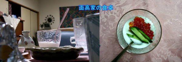 夜遅くなって面高さん出張からお帰りです。ヨーグルトに胡瓜といくら、これでもちょっとご馳