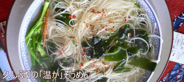ともかく朝は簡単に、温かいそうめんにしました。残っていた菜の花の茎